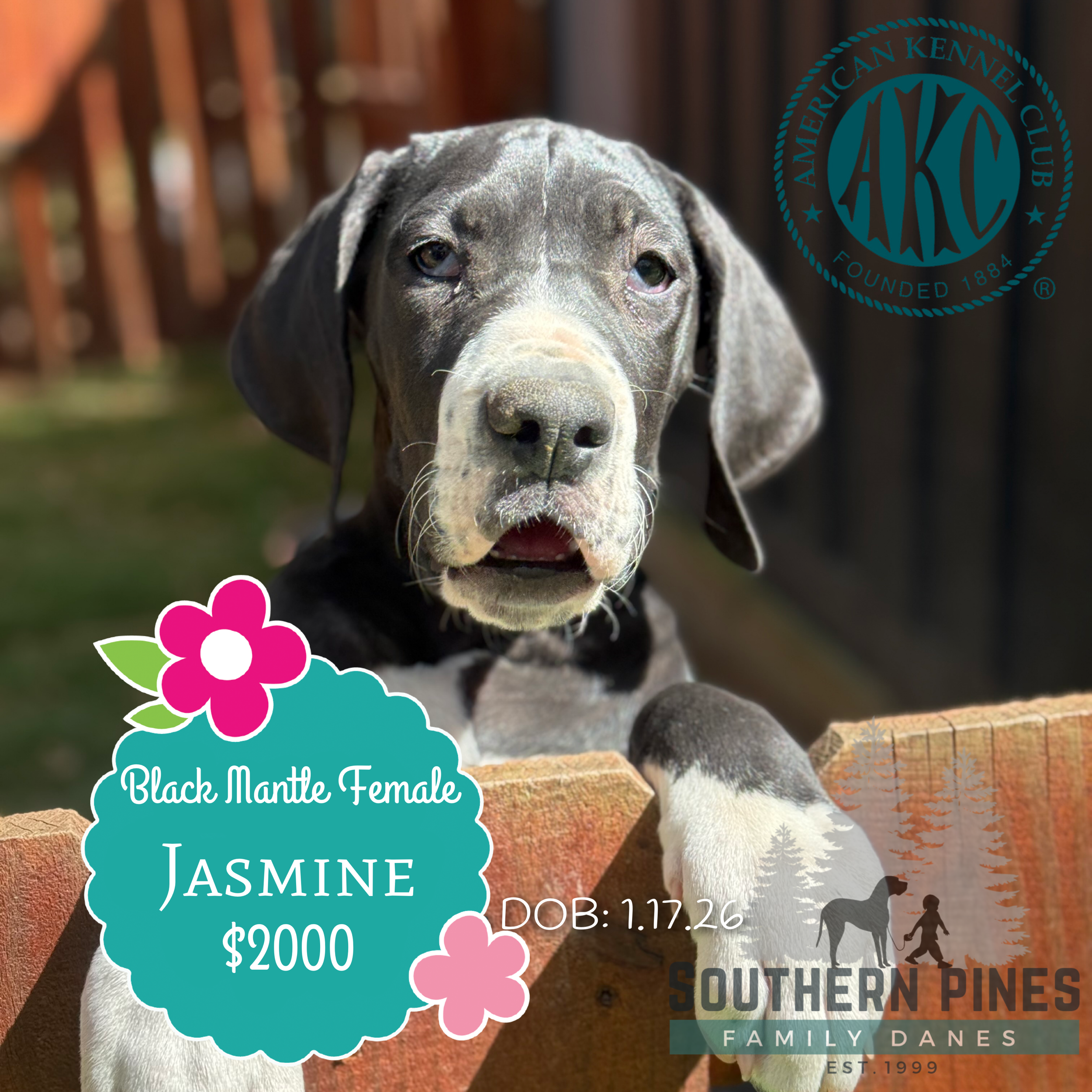 Jasmine is a lovely black mantle female from our Southern Pines Friends & Family program. That means she was born and raised in the home of one of our trusted partner families before transitioning to our nursery to continue our Southern Pines program. She has elegant markings and a gentle expression, and we expect her to be a wonderful family companion.